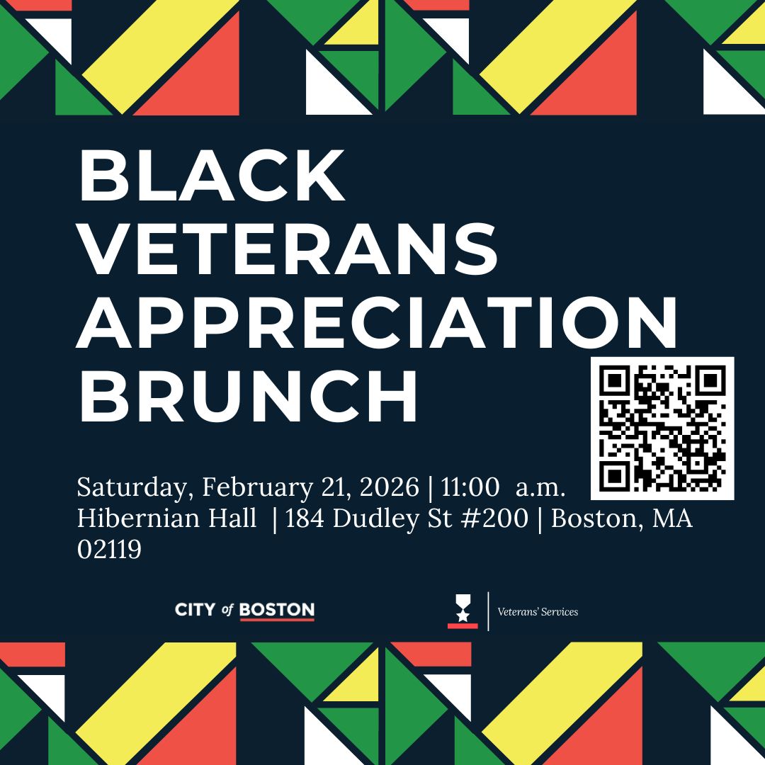 Please join us and Mayor Wu in celebrating and honoring the contributions and sacrifices of Black Veterans in helping to create and add to our great nation's legacy. This event will be held on Saturday, February 21, 2026. The location of this event is will be at Hibernian Hall, 184 Dudley St #200, Boston, MA 02119.