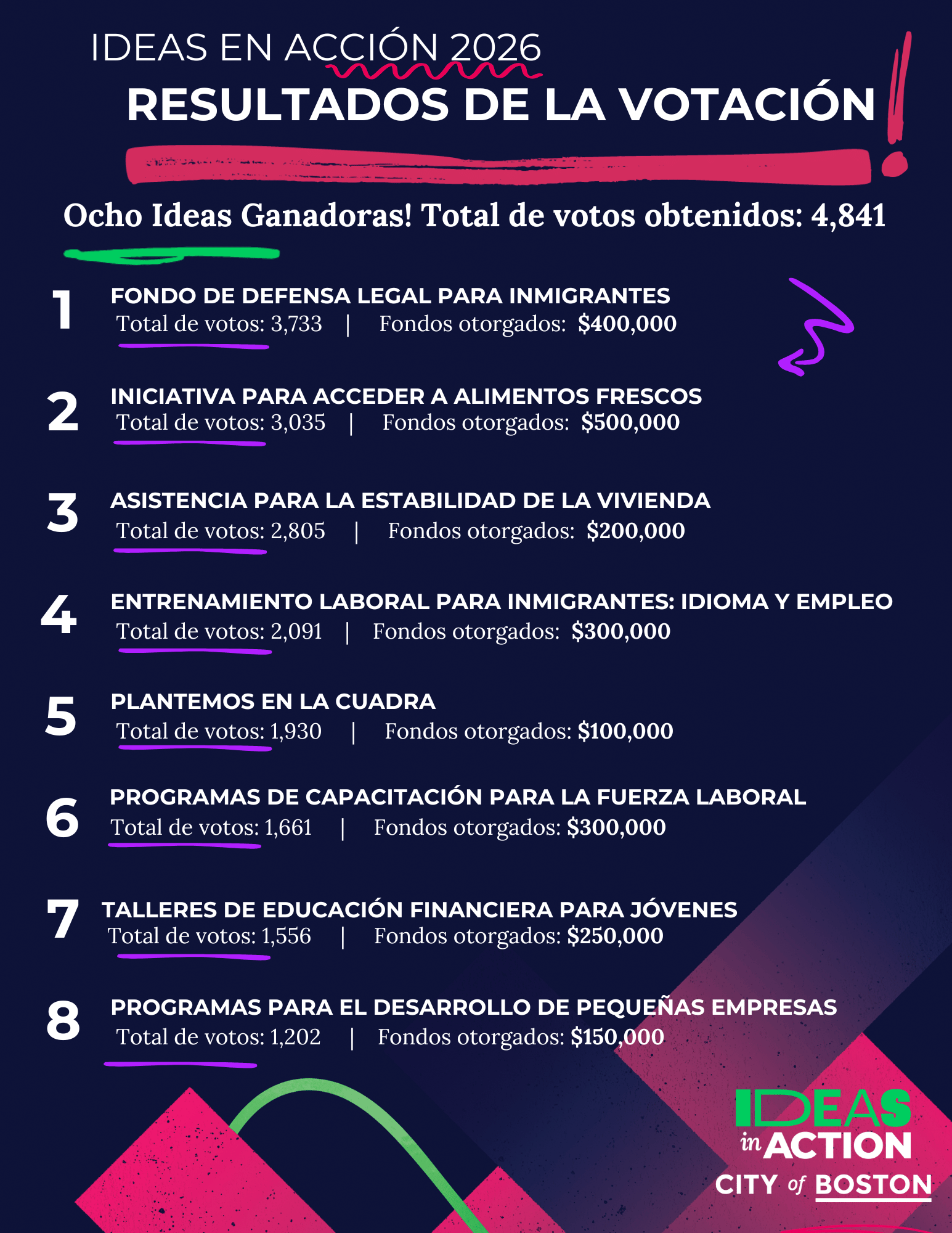 A total of 4841 Boston residents voted online and in-person for up to 5 of their favorite proposals. These were the most voted ideas to be funded up to 2.2 million.
