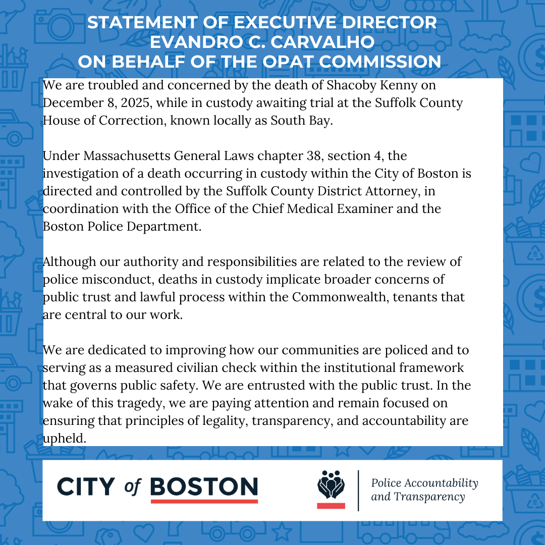The Office of Police Accountability and Transparency (OPAT) is a civilian body that investigates complaints of Boston Police Department misconduct.